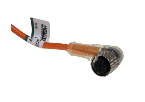 Cabo de 5 metros com conector M12 fêmea 90º de 4 vias. Possui LED de indicação de operação. Uso exclusivo com sensores PNP com saída M12.